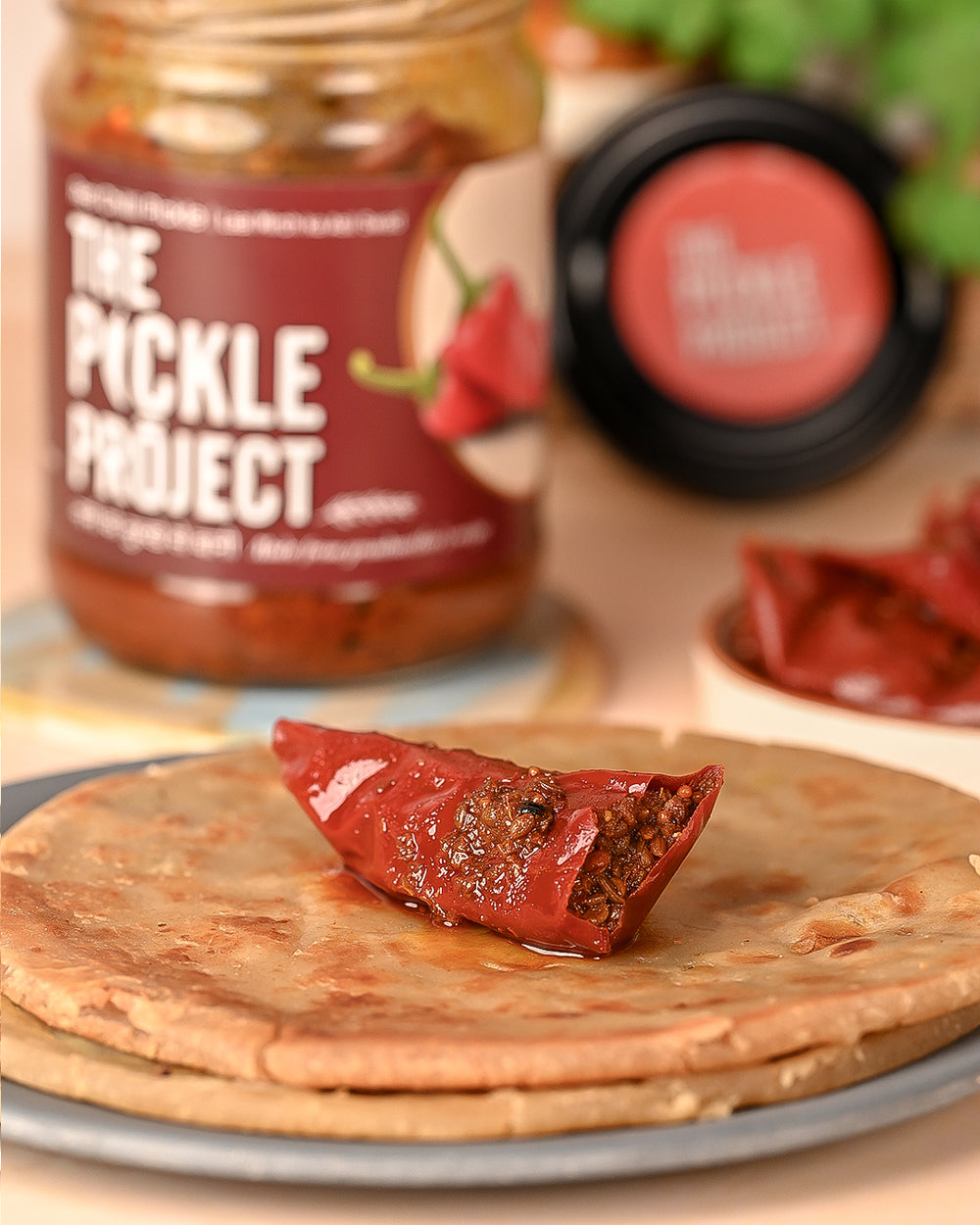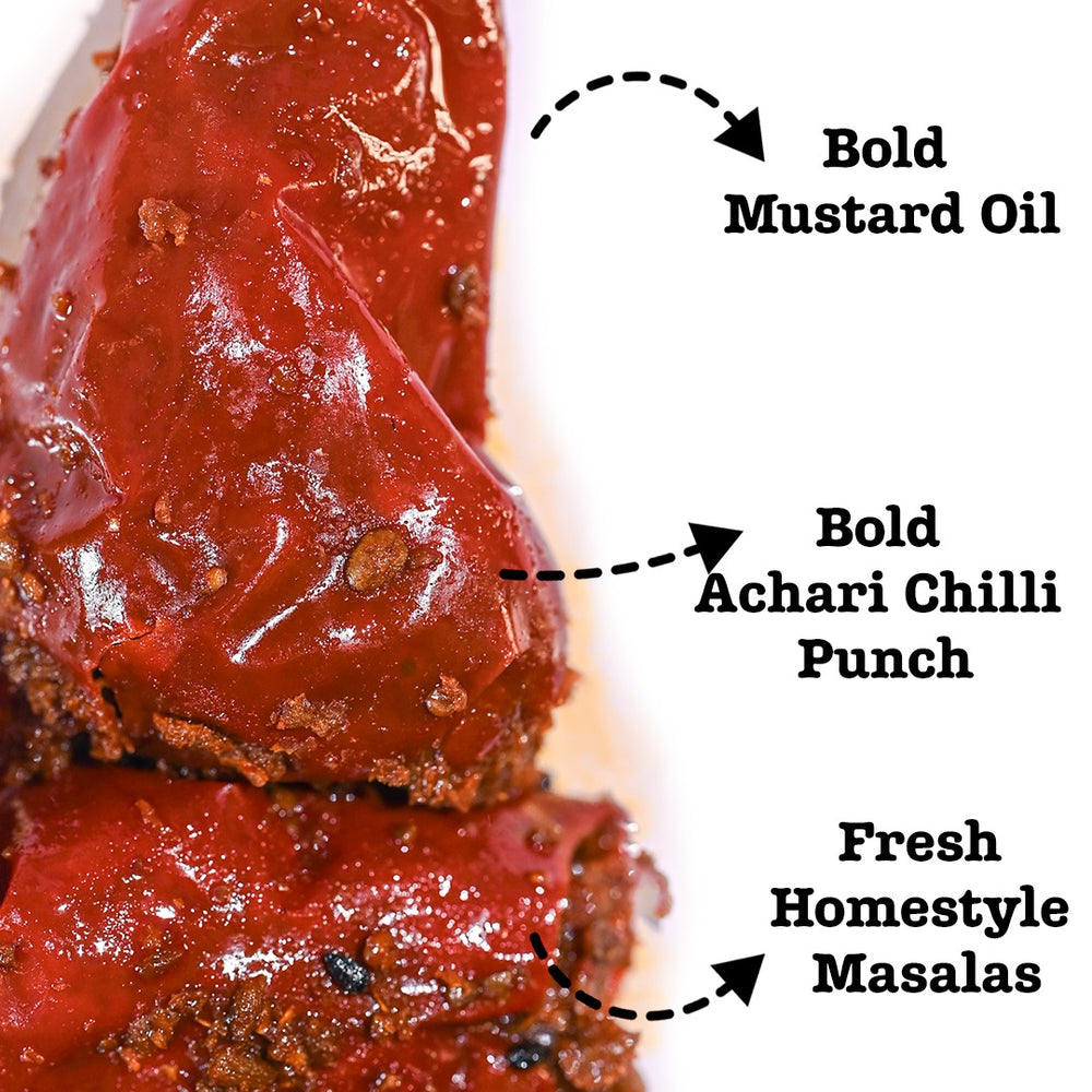 Also known as Banarasi Lal Mirch, this stuffed red chilli pickle is a traditional favorite from Bihar and Uttar Pradesh. Made with thick, fresh red chillies that are carefully hand-stuffed with roasted spice masala and sun-dried for 7-10 days.